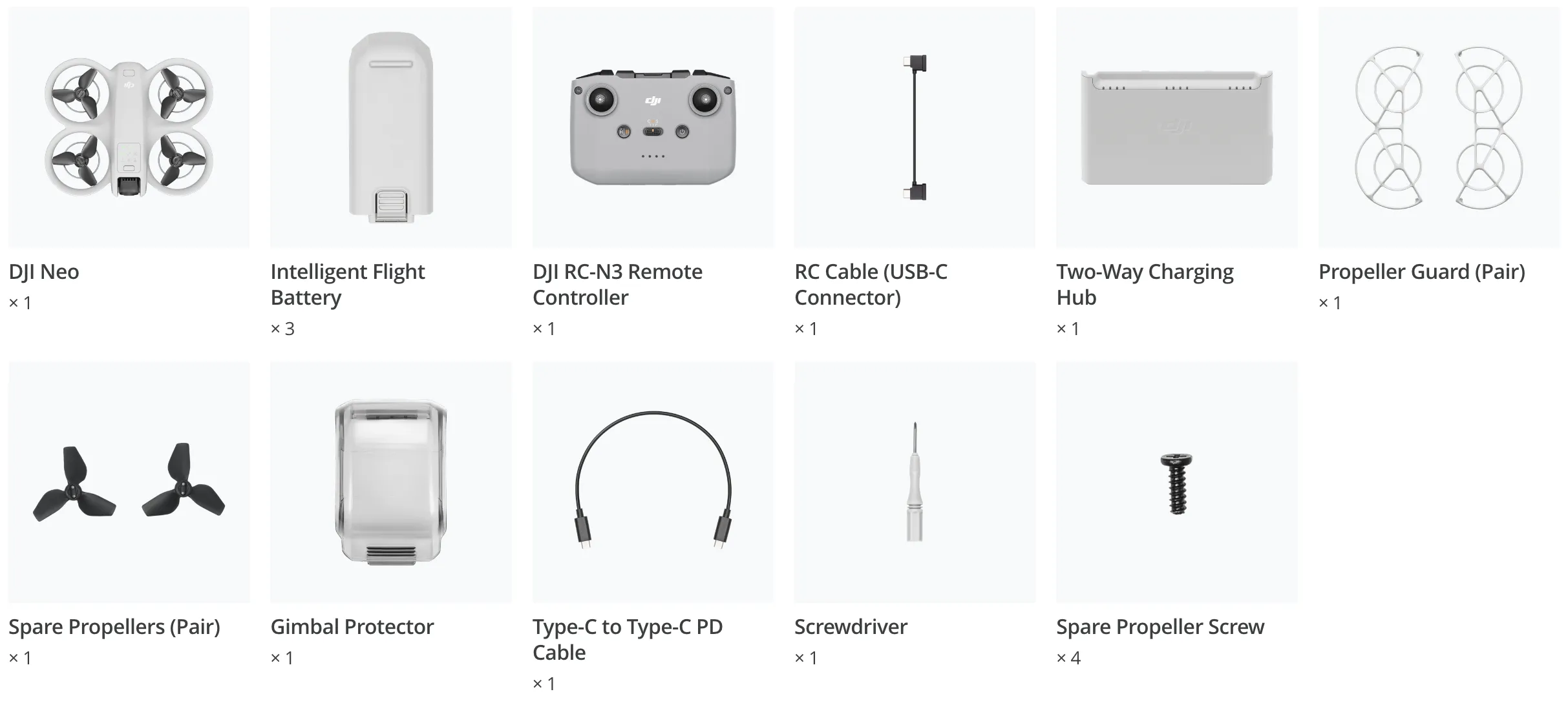DJI Neo Fly More Combo inkluderer flyet, en RC-N3 fjernbetjening, tre intelligente batterier, et tovejs opladningshub og mere, hvilket giver overlegen flyvekontrol og kameraoperation, for daglig til præcis luftskabelse.