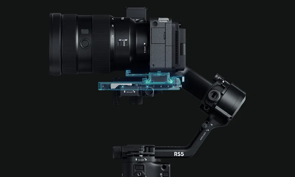 Skift hurtigt mellem gimbal og stativ med både Arca-Swiss-plade øverst og Manfrotto-plade nederst – uden at skulle balancere kameraet igen, fordi positionen huskes. Den øverste plade har desuden en justerbar føring, så kameraet monteres stabilt og sikkert.