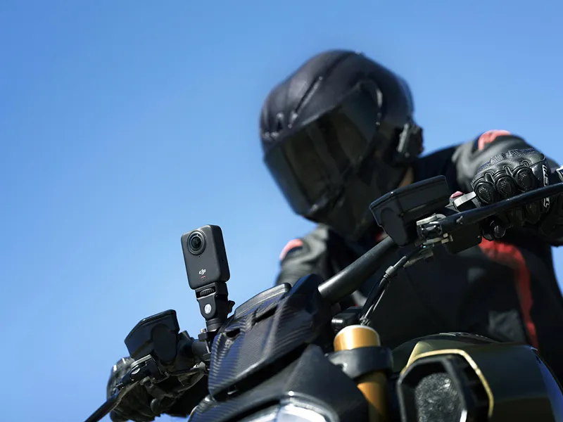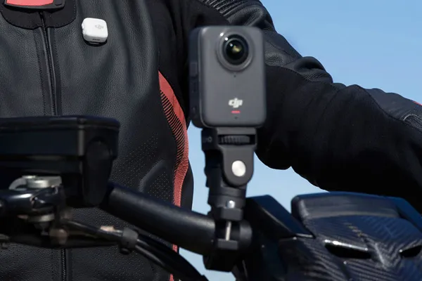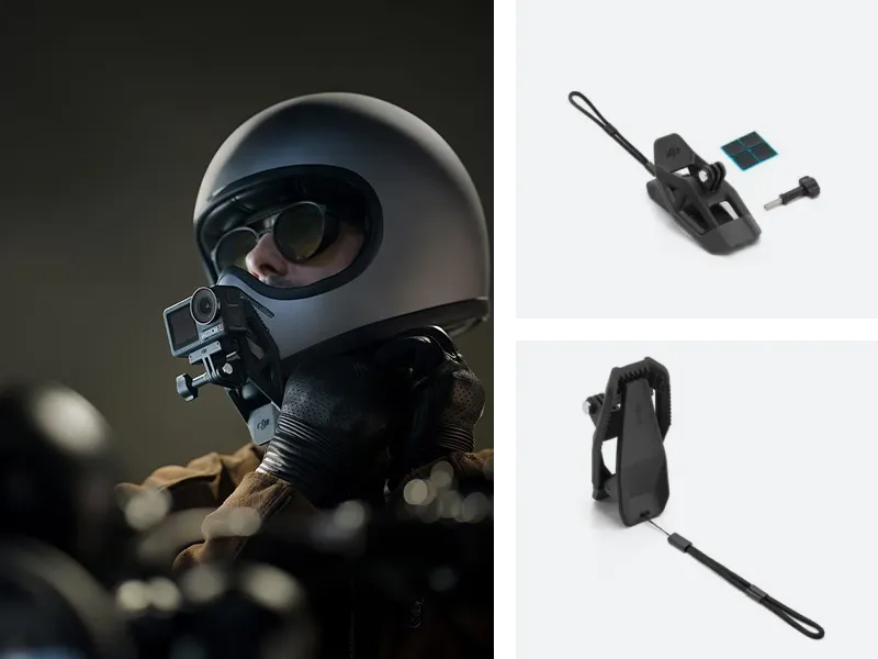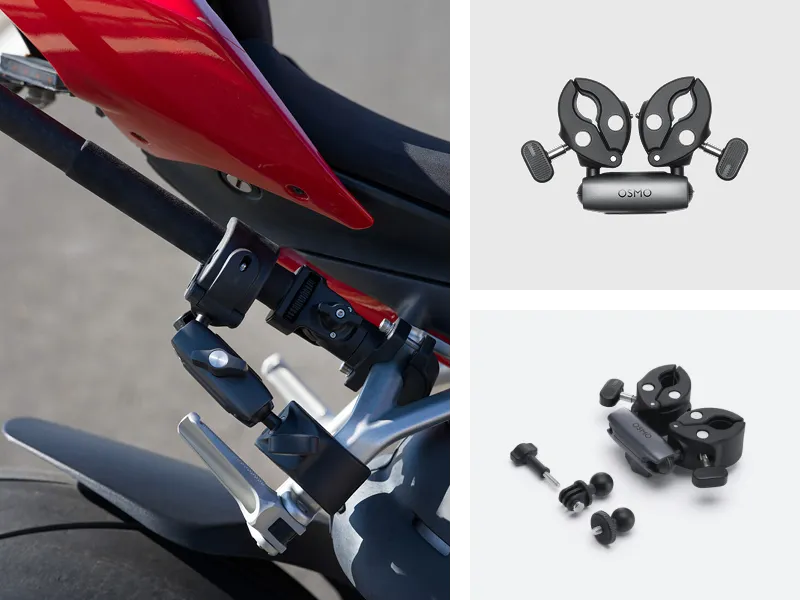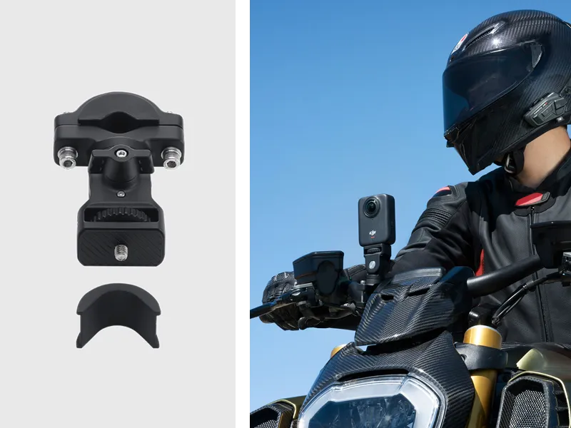 Inkluderer desuden et Osmo Motorcycle Heavy-Duty Mount og mere. Fastgør kameraet sikkert selv på ujævne ture, med hurtige vinkeljusteringer for problemfri optagelse på farten.