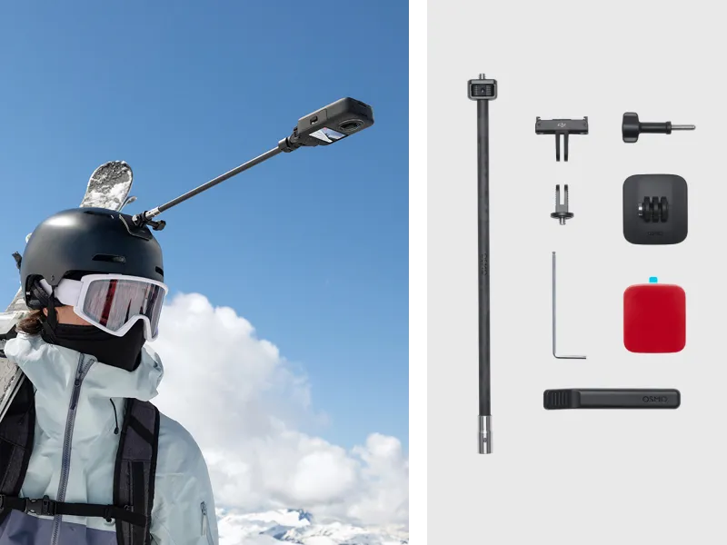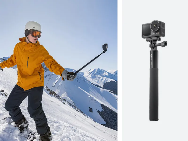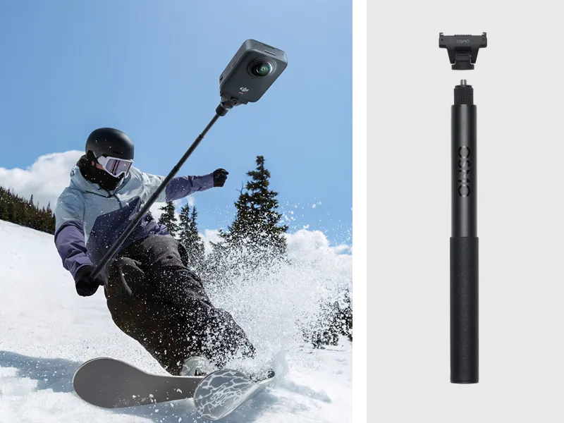 Når den bruges med Osmo 360, forsvinder selfiestangen fra billedet og muliggør et dramatisk tredjepersonsperspektiv; den kan forlænges op til 1,2 meter og tilbyder et bredere synsfelt. Udstyret med en justerbar hurtigudløseradapter, understøtter den hurtig vinkeljustering, hvilket opnår enten den usynlige selfiestangeffekt eller præcis enkelt-linse indramning.